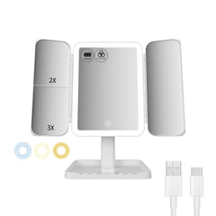 Type-C Rechargeable Portable 2X 3X Magnification Adjustable Tabletop Travel Led Folding With Light Trifold Makeup Vanity Mirror